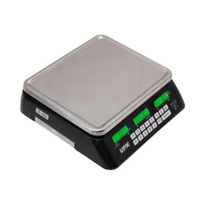 Visor duplo LCD para operador e cliente, 3 indicadores (peso, preço/kg e preço total) com 6 dígitos de 13 mm, prato em aço inox 345×275 mm, teclado com 15 teclas, recurso de tara. estrutura em ABS, pés reguláveis e saída serial para computador.