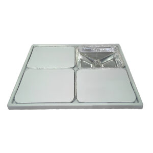 Bandeja plástica com 4 divisões interna para transportar Marmitex quadrada em caixas térmicas Hot Box. Produzida em PS (poliestireno) através do processo de vacuum forming, esta bandeja oferece durabilidade, praticidade e eficiência para transporte de marmitas quadrada.