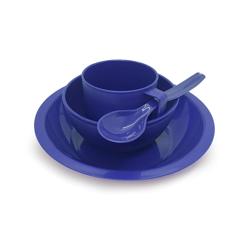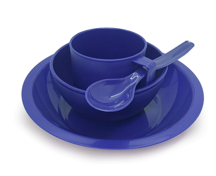 O Kit Merenda escolar é composto por prato, cumbuca, caneca, colher, faca e garfo e como opcional a bandeja plástica para merenda escolar.