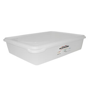 Caixa plástica para preparação, armazenagem e congelamento, fabricada em polietileno branco virgem, resistente, empilhável e encaixável.