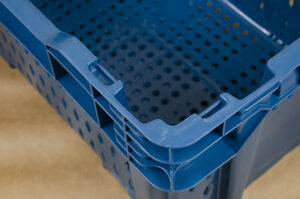 Caixa plástica vazada encaixável e empilhável 45 Litros RP-27, fabricada em PEAD polietileno alta densidade com área para gravação de nomes e logomarcas, alças laterais e superfícies vazadas.