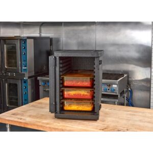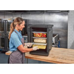 A caixa térmica Cambro GoBox EPP400110 é utilizada como caixa térmica Hot Box em restaurante, hotel, hospital e indústria de refeições coletivas para transportar alimentos preparados e refeições quentes e refrigeradas acondicionados em cubas gastronômica padrão GN de aço inox ou de policarbonato, mantendo a temperatura dos alimentos quentes até 75° C e dos alimentos refrigerados até 4° C.