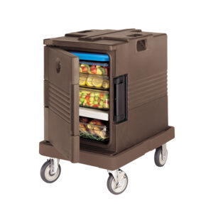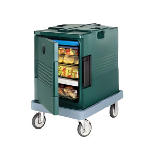 Caixa térmica Cambro UPC400 com carrinho Cambro CD400110 para transportar e fazer abastecimento frontal de cubas GN, mantem a temperatura dos alimentos quentes até 81,7 C° e dos alimentos refrigerados até 1,5 C° durante o transporte.
