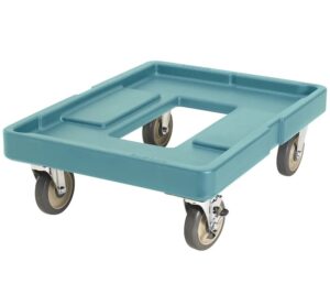 O carrinho Cambro CD400110 tem capacidade para 140 Kg, rodas giratórias de 5” com freios, cantos arredondados e transporta até 2 caixas térmicas hot box.