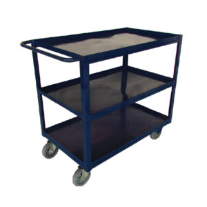 Carrinho com 3 bandejas, fabricado em aço carbono com bandejas de bordas dobradas e puxador tubular frontal.