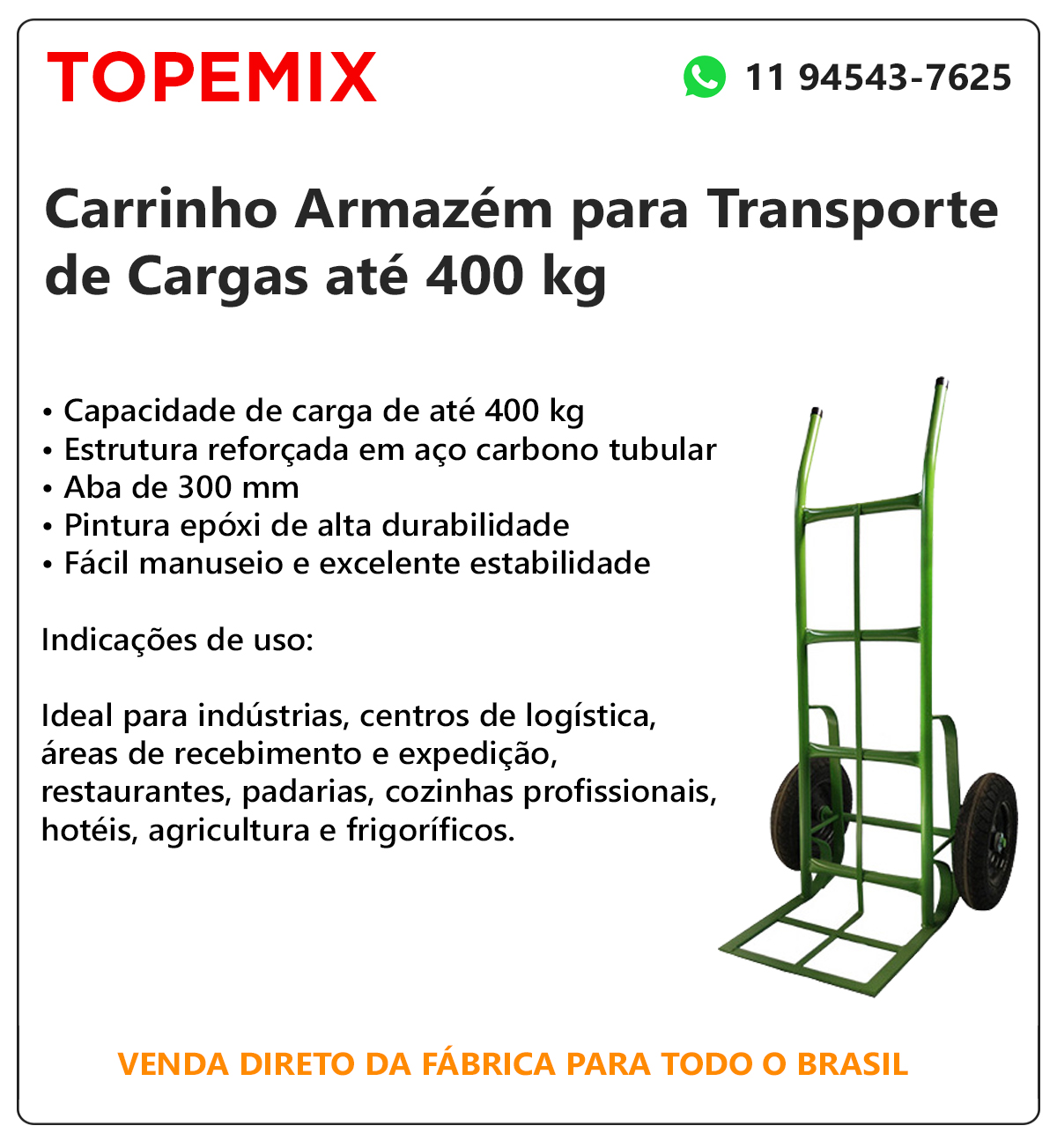 Fabricado em aço carbono tubular, o carrinho possui aba de apoio de 300 mm, garantindo maior estabilidade durante o transporte. Seu acabamento em pintura epóxi oferece excelente proteção contra corrosão e desgaste, disponível nas cores verde, azul, cinza, vermelho, laranja, etc. Proporciona alta estabilidade e excelente desempenho em diversos tipos de piso.
