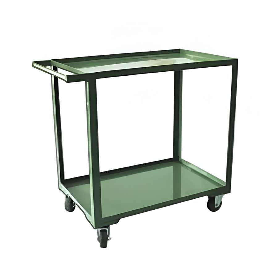 Carrinho com 2 bandejas, fabricado em aço carbono com bandejas de bordas dobradas e puxador tubular frontal.