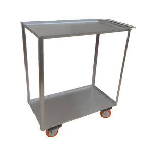 Carrinho bandeja com 2 planos de inox, fabricado em chapa de aço inoxidável com bordas dobradas e puxador frontal.