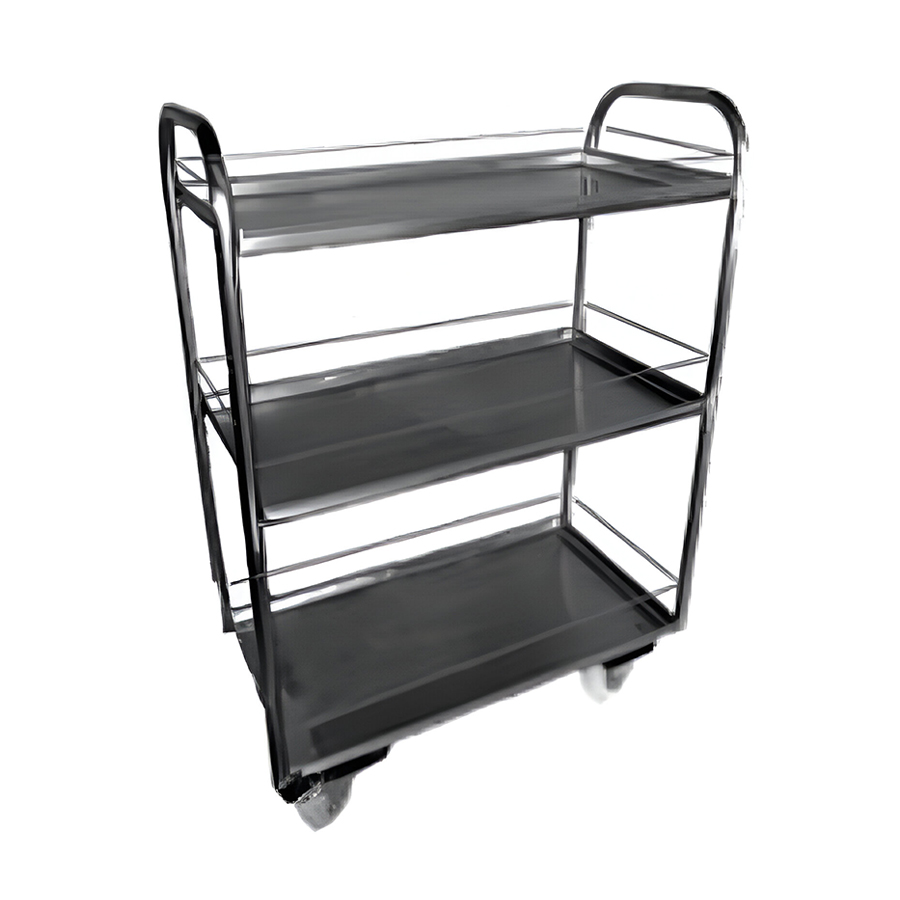 Carrinho bandeja com 3 planos com bordas dobradas e com gradil nas laterais, fabricado em chapa de aço inox polido com gradil em todas laterais para evitar quedas de produtos no transporte.