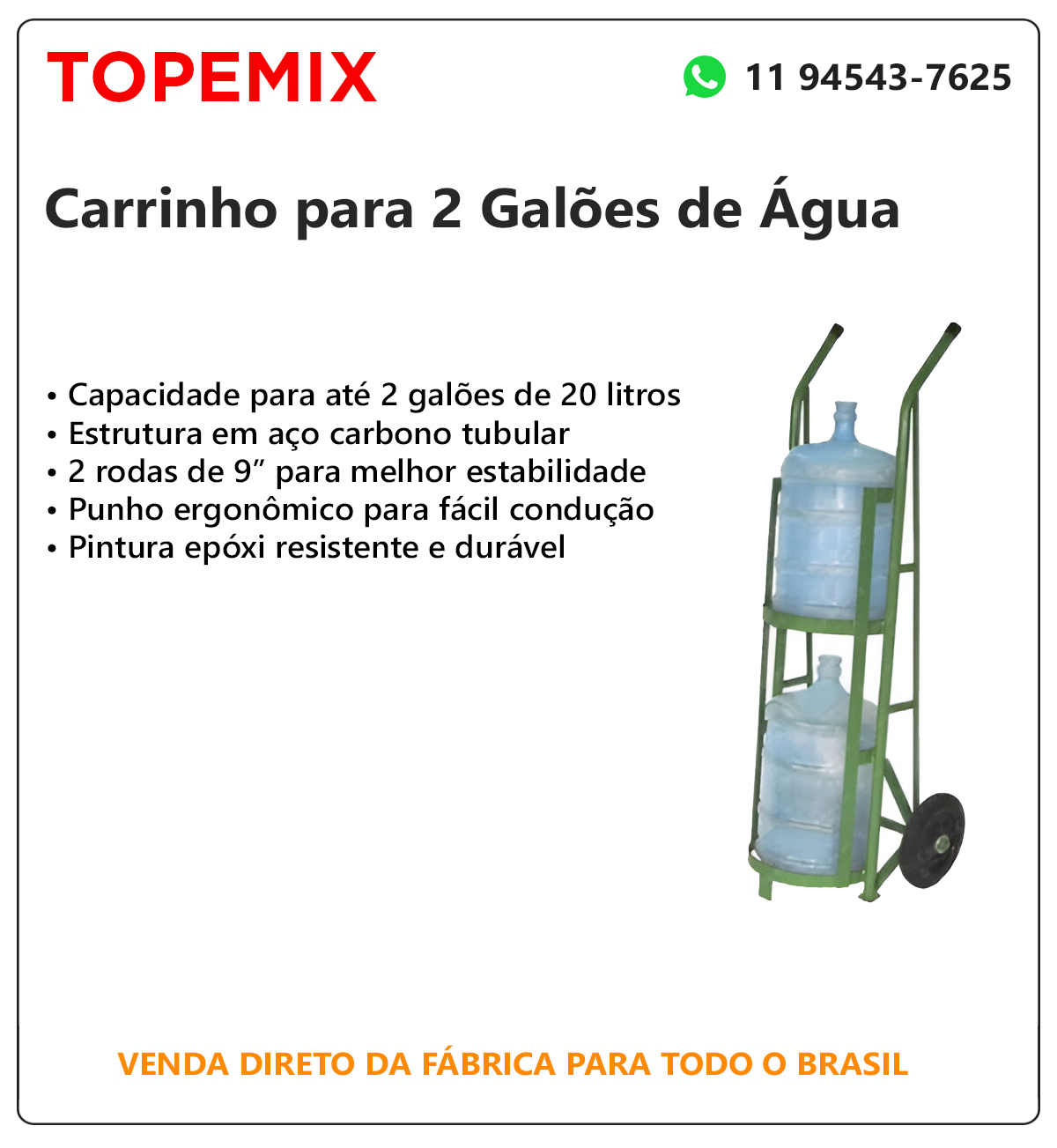O acabamento em pintura epóxi aumenta a proteção contra corrosão e desgaste. O sistema de locomoção é composto por 2 rodas de 9″.
