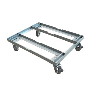 Carrinho para transportar caixas térmicas vertical hot box, fabricado em aço carbono com 4 rodízios de 3” fixos e giratórios, com freio e pintura de alta resistência oxidação.