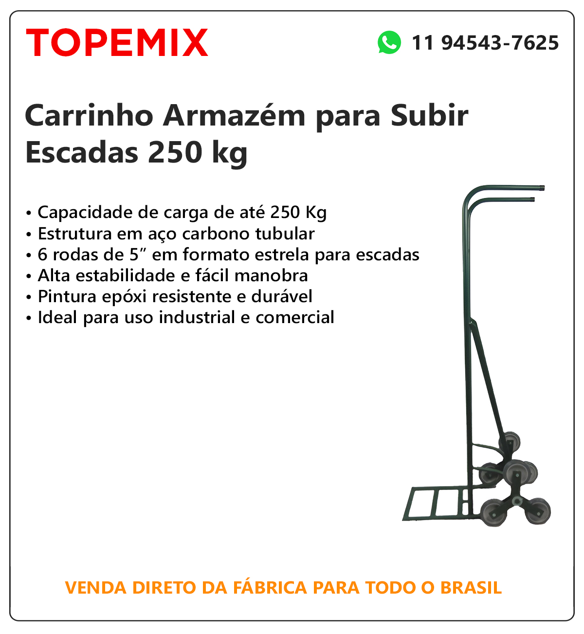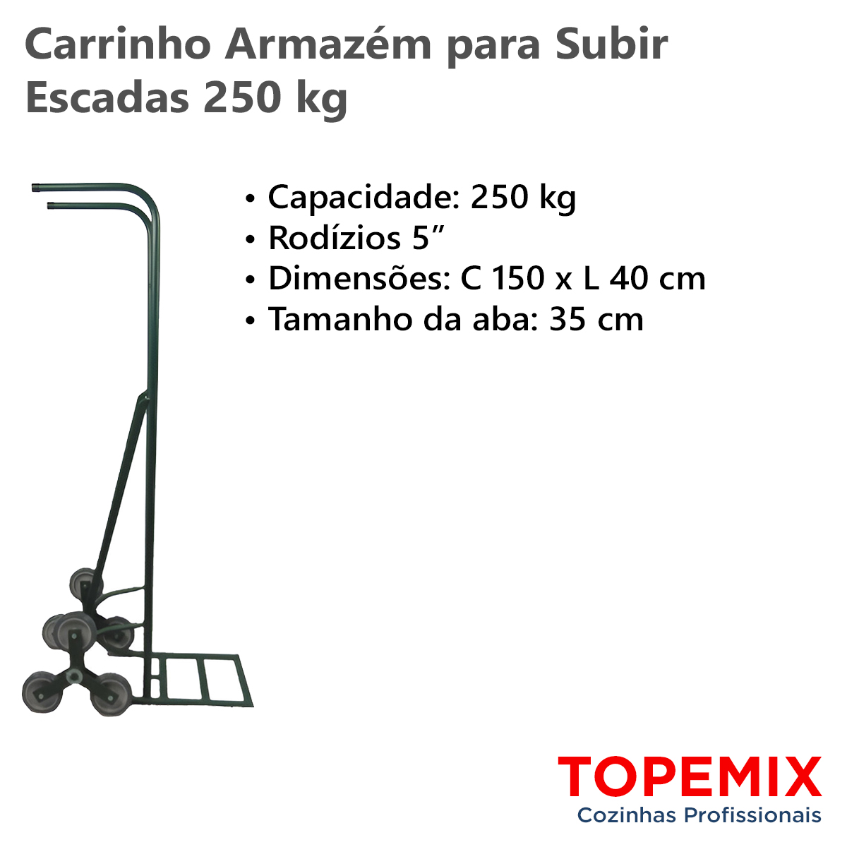 Carrinho de transporte para subir escadas e degraus com capacidade de carga de até 250 kg. Fabricado em aço carbono tubular, o carrinho possui aba de 280 mm e acabamento em pintura epóxi.