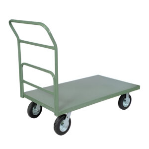 Carrinho plataforma com assoalho de chapa de aço carbono e aba tubular para facilitar a movimentação e fixação da carga no transporte em geral nas áreas de recebimento, produção e logística de indústrias, construção civil, agricultura, cozinhas industriais, supermercados e condomínios.