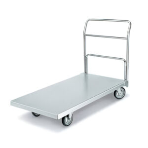Carrinho plataforma em aço inoxidável com aba tubular para transportar alimentos e produtos em geral em locais úmidos e molhados ou que necessitam de alta proteção a oxidação, em indústrias químicas, farmacêuticas e alimentícias, frigoríficos, regiões marítimas, caminhões frigoríficos, câmaras frias e cozinhas profissionais.