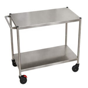 Carro bandeja com 2 planos, fabricado em aço inox com estrutura reforçada e tampos com superfície lisa em chapa de aço inox de fácil higienização.