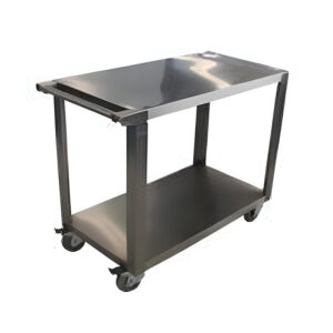 Carro bandeja dois planos, fabricado em aço inox com estrutura em cantoneira e tampo com superfície lisa em chapa de aço inox reforçada.