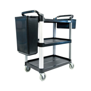 Carro utilitário Cambro triplex com porta talheres e recipiente de lixo, produzido em polipropileno com estrutura em tubo de alumínio anodizado.