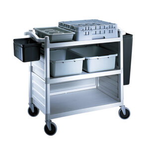 O carro utilitário Cambro triplex com porta talheres e recipiente de lixo é utilizado em cozinhas industriais e restaurantes de hotéis, hospitais e industrias no transporte de bandejas, pratos, talheres, toalhas, itens de limpeza e lavanderia.