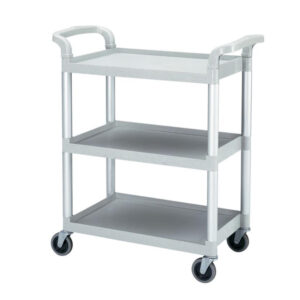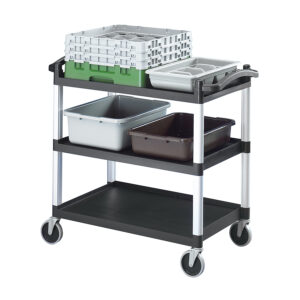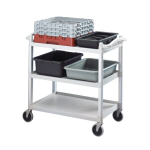 Carro utilitário Cambro BC340KD triplex, produzido em polipropileno com estrutura em tubo de alumínio anodizado.