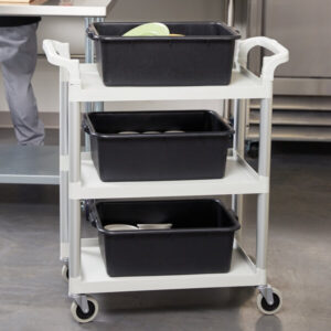 Rodas de 4” giratórias que facilitam o deslocamento em corredores e elevadores. Cores preto ou branco. Preço de carro utilitário Cambro direto do distribuidor.