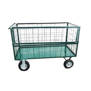 Carrinho Caixa Telado com assoalho de aço e meia porta, para transporte e movimentação de cargas pesadas, suportando até 500 Kg. Estrutura em aço carbono de alta resistência e contorno totalmente telado. Possui meia porta lateral com trinco de segurança.