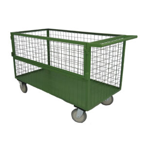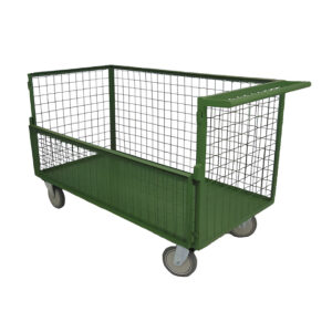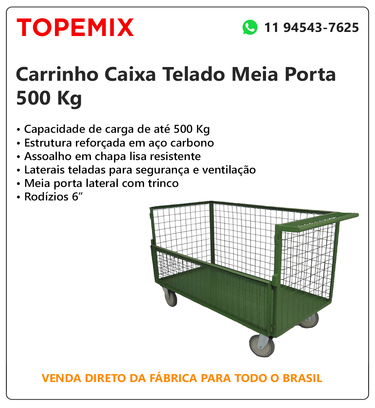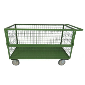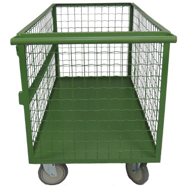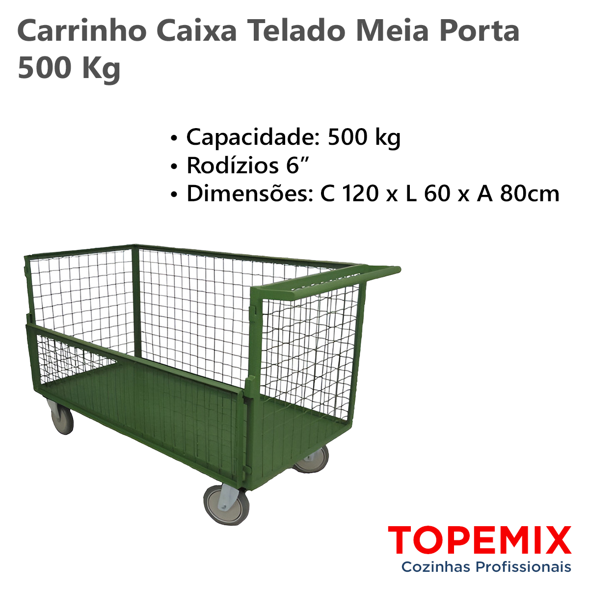 Carrinho Caixa Telado com Meia Porta para transporte e movimentação de cargas pesadas, suportando até 500 Kg. Estrutura em aço carbono de alta resistência, com assoalho em chapa lisa e contorno totalmente telado. Possui meia porta lateral com trinco de segurança.