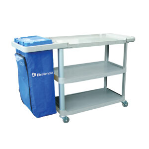 Carro camareira arrumadeira aberto Bralimpia, produzido em polipropileno e tubo de alumínio anodizado.