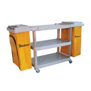 Carro camareira arrumadeira aberto Bralimpia, produzido em polipropileno e alumínio anodizado com 3 planos de alta resistência, sem fechamento nas laterais, com 2 bolsas em vinil de 90 Litros e 4 rodas giratórias que facilitam o deslocamento em corredores e elevadores de hotéis, motéis, hospitais e restaurantes no transporte de conjuntos de cama, mesa e banho, roupas, produtos de limpeza e descartáveis.