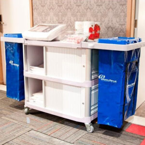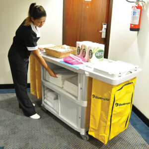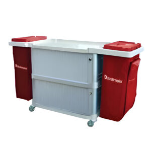 Utilizado como carro de arrumadeira para fácil deslocamento em corredores e elevadores de hotéis, motéis e hospitais para transportar conjuntos de cama, mesa e banho, roupas, produtos de limpeza e descartáveis.