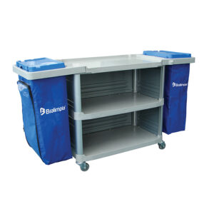 Carro camareira arrumadeira fechado Bralimpia, produzido em polipropileno e alumínio anodizado, com 3 planos de alta resistência, com fechamento nas laterais com 2 bolsas em vinil de 90 Litros e 4 rodas giratórias que facilitam o deslocamento em corredores e elevadores de hotéis, motéis, hospitais e restaurantes no transporte de conjuntos de cama, mesa e banho, roupas, produtos de limpeza e descartáveis.