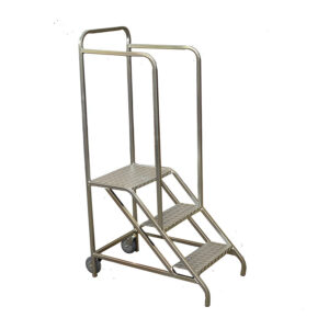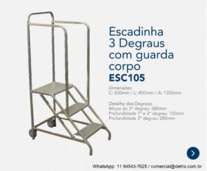 Degraus antiderrapante (piso xadrez). Estrutura em aço carbono. Rodas traseira de 4″. Pintura epóxi cor cinza ou zincagem eletrostática.