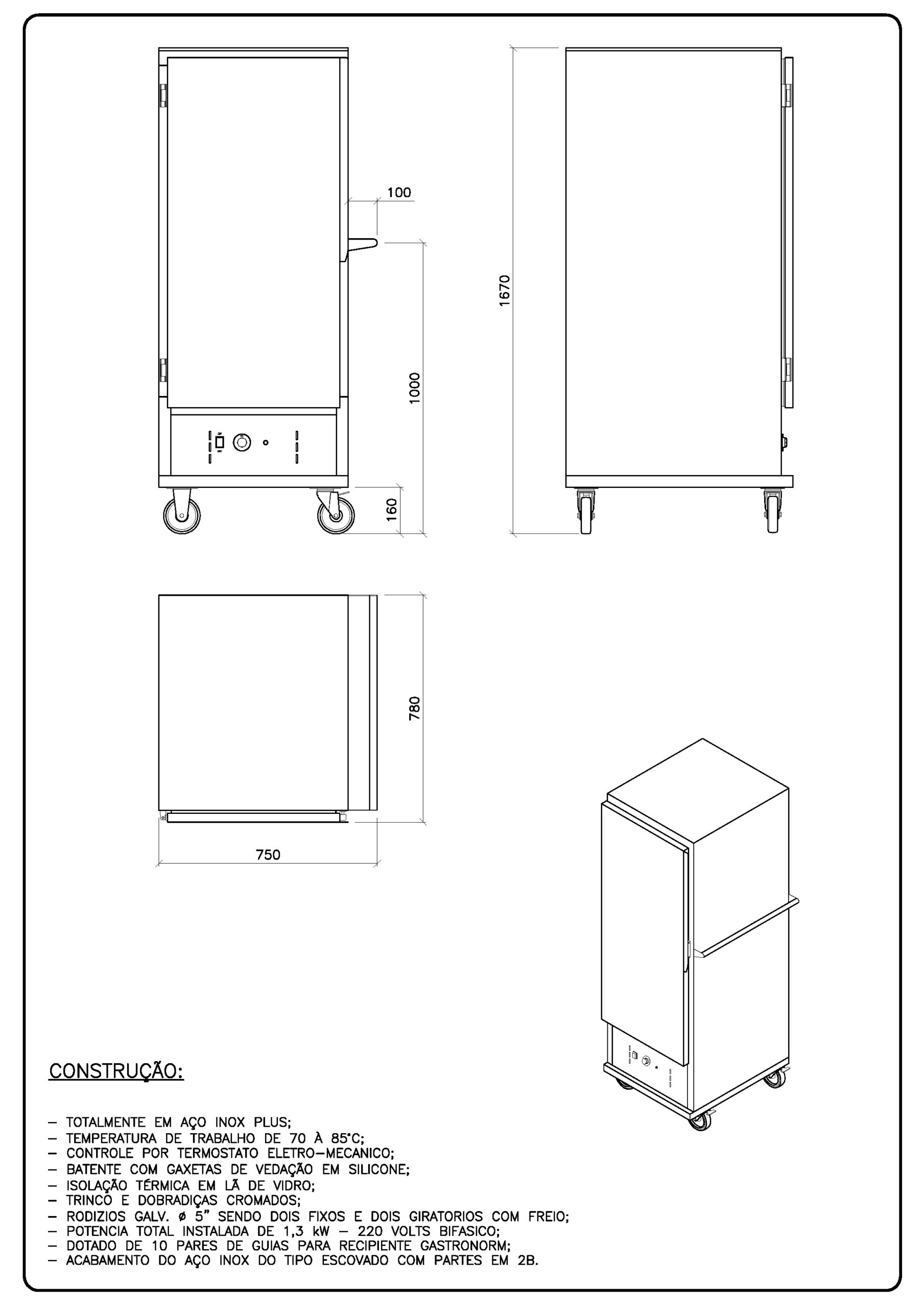 Conta com puxador tubular, rodízios de 5” para fácil deslocamento, termostato regulável até 85ºC e reservatório umidificador, que mantém a temperatura homogênea e evita o ressecamento dos alimentos durante o armazenamento e transporte.