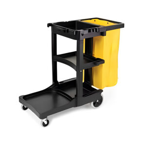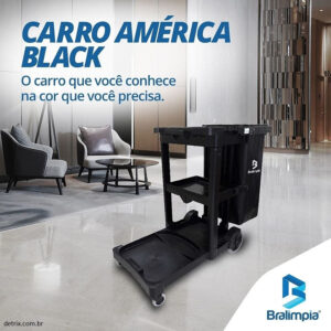 Modelo na cor preta com saco de vinil para coletar lixo e para acondicionar acessórios e produtos para tarefas de limpeza úmida e seca de pisos e paredes em hotéis, restaurantes, lojas, shoppings, indústrias e condomínios.