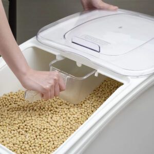 Tampa deslizante transparente para identificar o conteúdo, com uma parte inclinada para facilitar o acesso e manuseio. Ideal para ingredientes a granel, como farinha, grãos e açúcar.