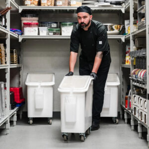 Utilizado como carrinho Cambro de Ingredientes para ser colocado por baixo de mesas de trabalho e para armazenar ingredientes secos a granel em indústrias de alimentos, lojas de fast food e cozinhas de restaurantes, hotéis, hospitais e industrias.