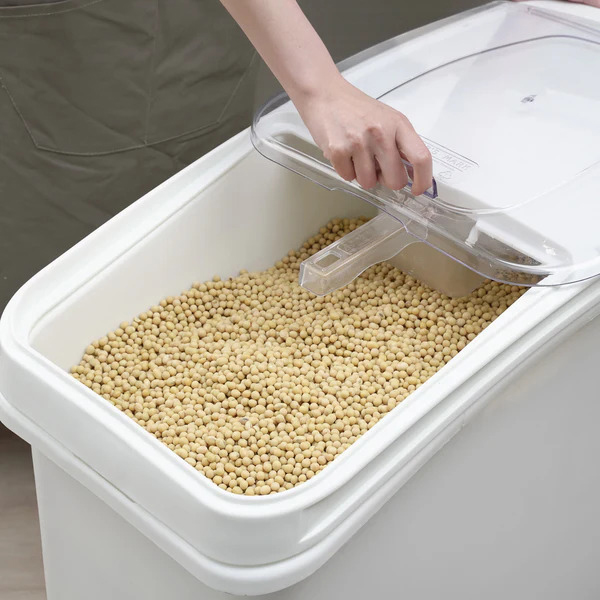 Tampa deslizante transparente para identificar o conteúdo, com uma parte inclinada para facilitar o acesso e manuseio. Ideal para ingredientes a granel, como farinha, grãos e açúcar.