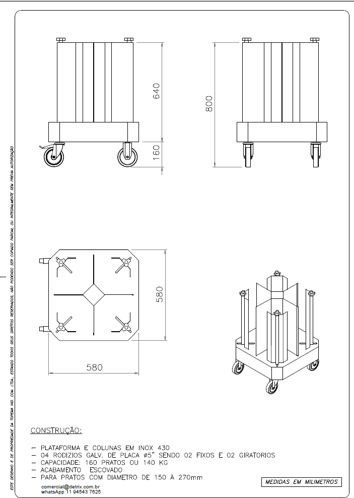 Carrinho porta pratos regulável para acondicionar, organizar e transportar pratos com segurança e praticidade em cozinhas profissionais. Fabricado em aço inox com acabamento escovado, possui 4 colunas móveis e reguláveis, permitindo a fixação segura de pratos com diâmetro entre Ø 150 mm e Ø 270 mm.