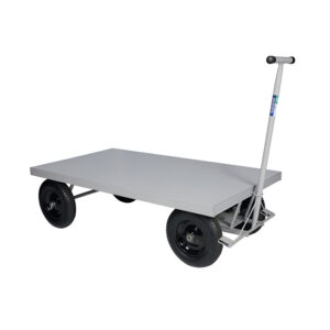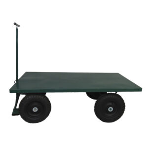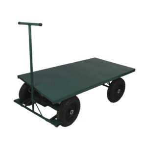 Carro plataforma com assoalho de chapa de aço carbono e sistema 5a. roda dotado de cabo de tração de aço em forma de “T” com articulação para frear e direcionar as manobras.