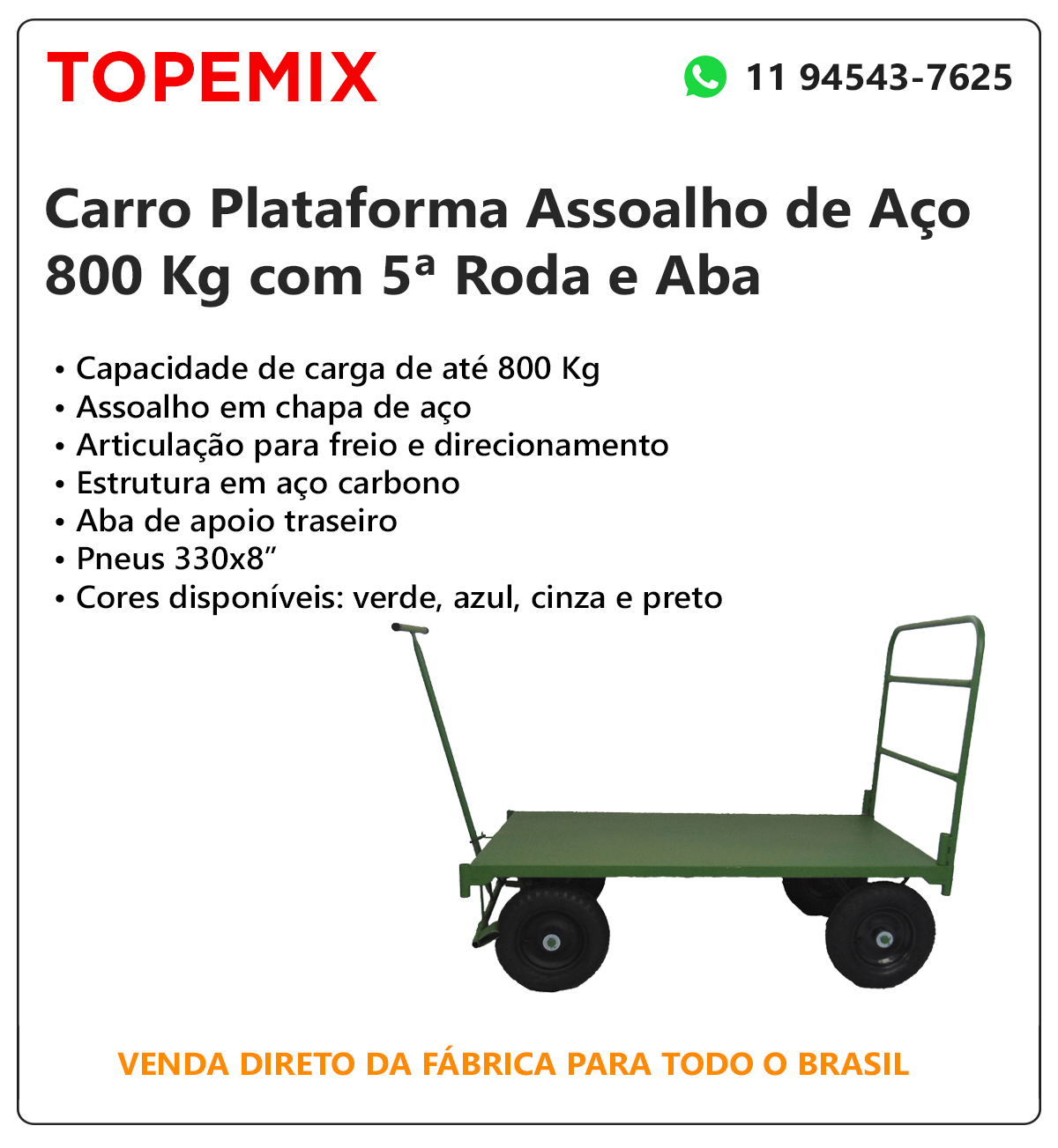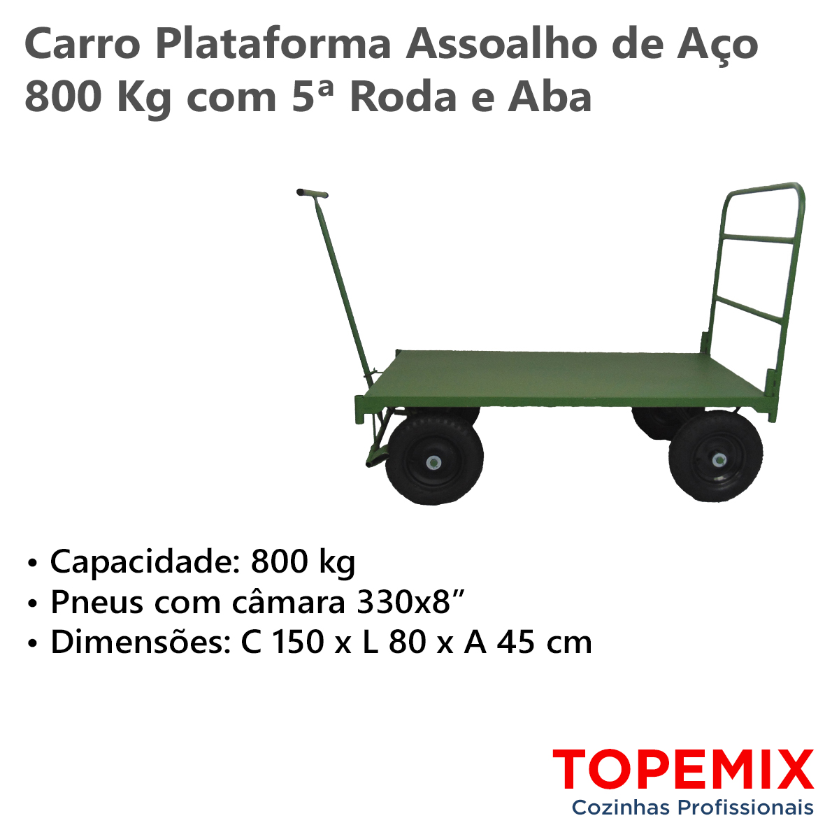 Carro Plataforma com assoalho de aço, aba de apoio traseiro e sistema 5ª roda, para transporte de cargas em geral até 800 Kg. A estrutura em aço carbono e o assoalho em chapa de aço, garantem alta resistência ao peso e ao uso intenso.