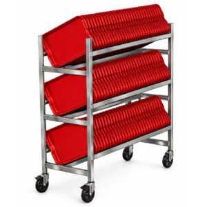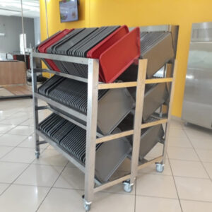 Carro para transportar e secar bandejas plásticas, fabricado em aço inox com encaixe para manter as bandejas inclinadas para escoar água após a lavagem.