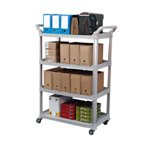 Carro strong Bralimpia aberto nas laterais, produzido em polipropileno e tubo de alumínio anodizado com 4 ou 5 planos. Extremamente resistente e versátil com 2 puxadores laterais e 4 rodas giratórias que facilitam o deslocamento em corredores e elevadores.