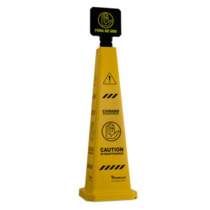 Cone sinalizador com placa sinalizadora Em Manutenção Bralimpia, produzido em polipropileno com gravações resistentes a riscos.