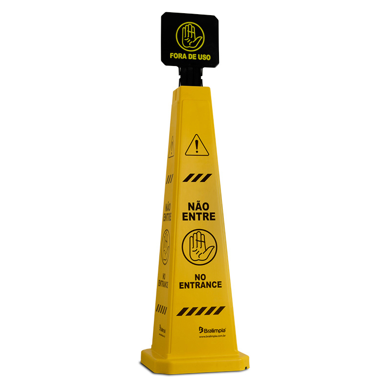 Cone sinalizador com placa sinalizadora Não Entre Bralimpia, produzido em polipropileno com gravações resistentes a riscos.