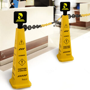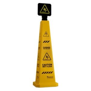 Cone sinalizador com placa sinalizadora Piso Molhado Bralimpia, produzido em polipropileno com gravações resistentes a riscos.