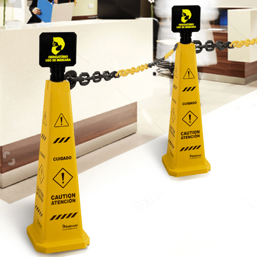 Utilizado como cone de sinalização em condomínio, indústria, hotel, hospital, restaurante, banco, shoppings e locais públicos para sinalizar e interditar áreas na prevenção de acidentes e pode ser utilizado em conjunto com corrente plástica demarcadora para organizar filas e demarcar e isolar ambientes.