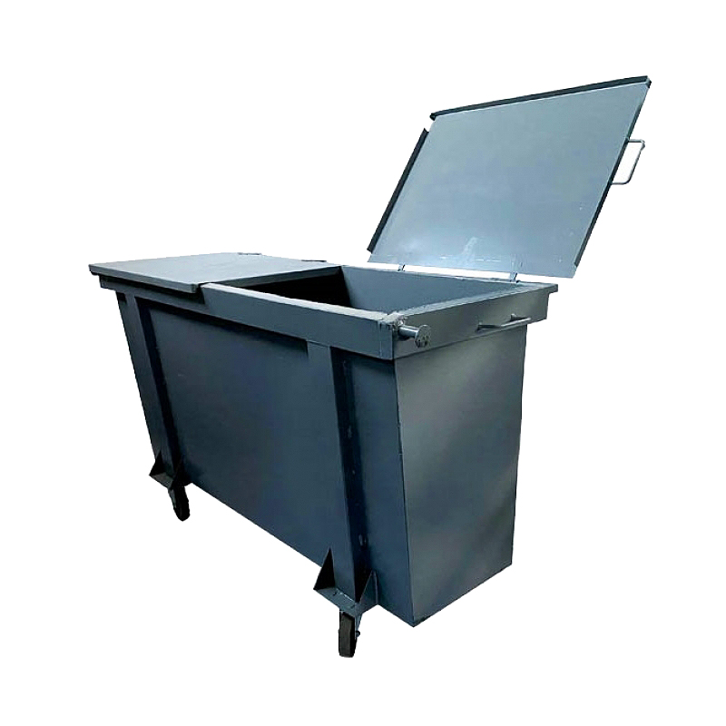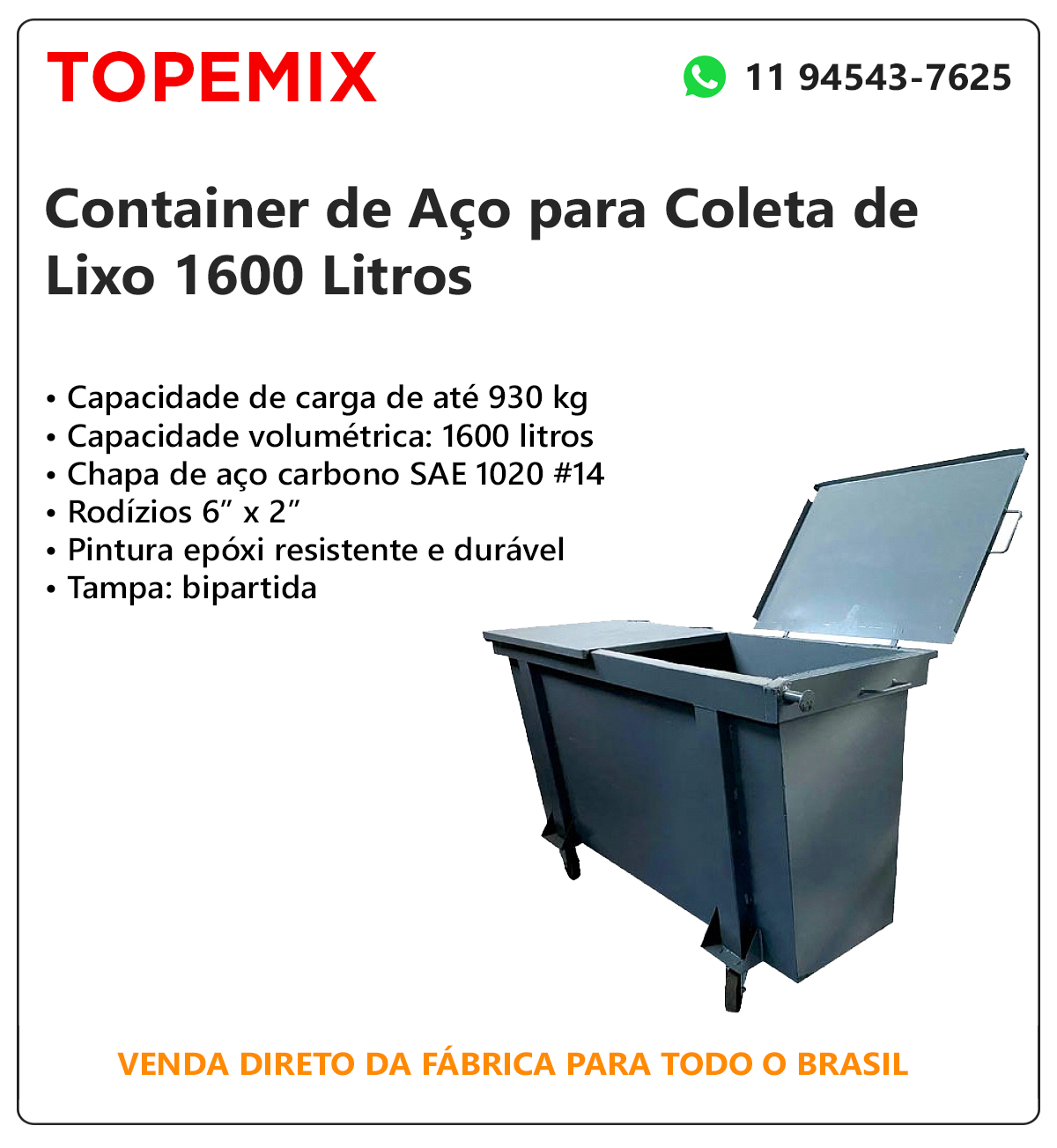 Container metálico com tampa bipartida para coleta de lixos e resíduos em conformidade com a Norma ABNT NBR 13334, fabricado em chapa de aço carbono SAE 1020 #14 (1.90 mm) com pinos de pega em aço carbono Ø 1 ¼” (31,75 mm) fixados por chapa estrutural de ¼” (6,35 mm) e rodízios fixados em chapa de aço carbono de 3/16″ (4,35 mm).