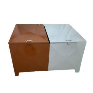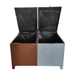 Container de aço galvanizado, fabricado em chapa de aço carbono com 1 a 2 tampas com amortecedor nas cores da coleta seletiva, divisórias interna, porta cadeado, dreno para líquidos e pés com suporte para fixar em pisos e calçadas.