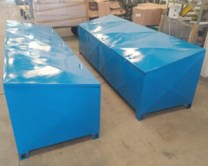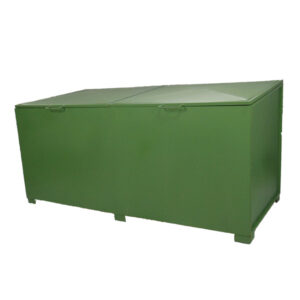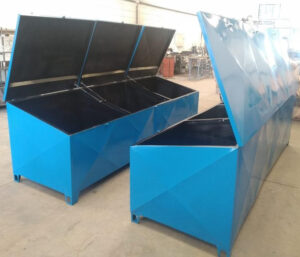 Container em aço galvanizado, fabricado em chapa de aço carbono com 2 a 4 tampas com amortecedor, divisória para separar lixo reciclável e não reciclável, porta cadeado, dreno para líquidos e pés com suporte para fixar em pisos e calçadas.