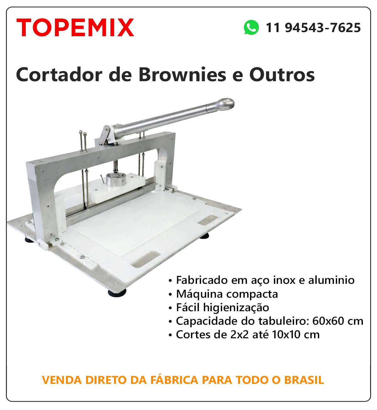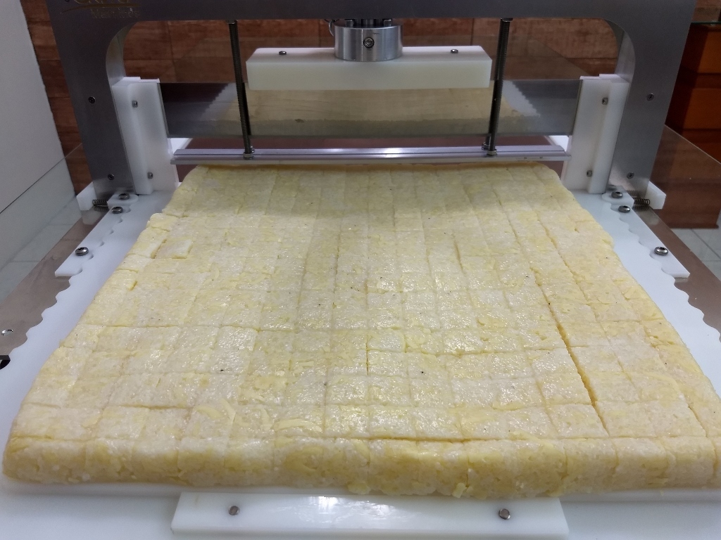 Cortador de brownies desenvolvido para agilizar e padronizar a produção, garantindo cortes uniformes e simétricos em brownies, palha italiana, dadinho de tapioca e outras sobremesas em formato similar.