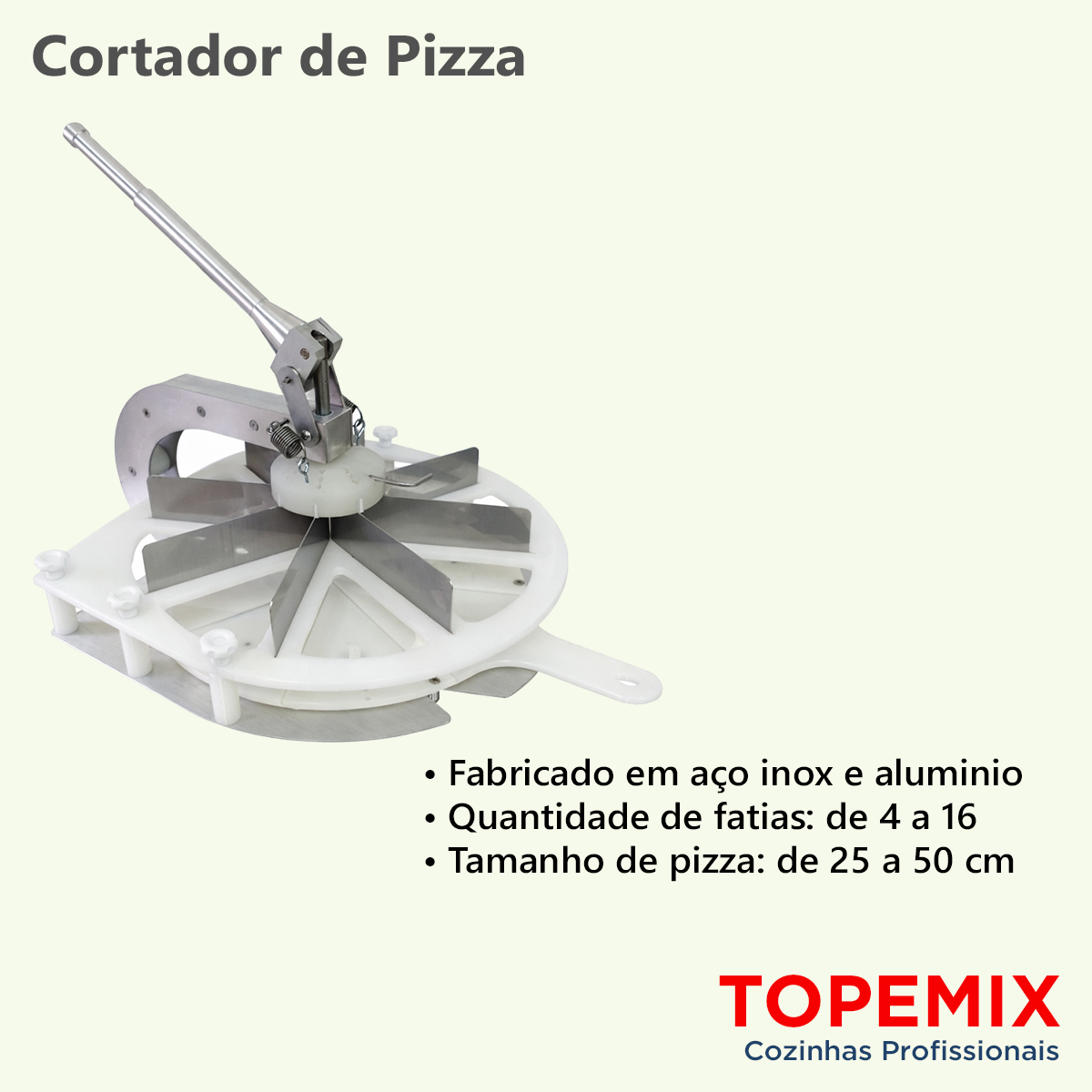 Cortador profissional de pizzas, desenvolvido para agilizar a produção de forma eficiente e uniforme, garantindo fatias precisas e simétricas em pizzas. Seu sistema de corte com lâminas em inox, proporciona um acabamento profissional ao produto final.